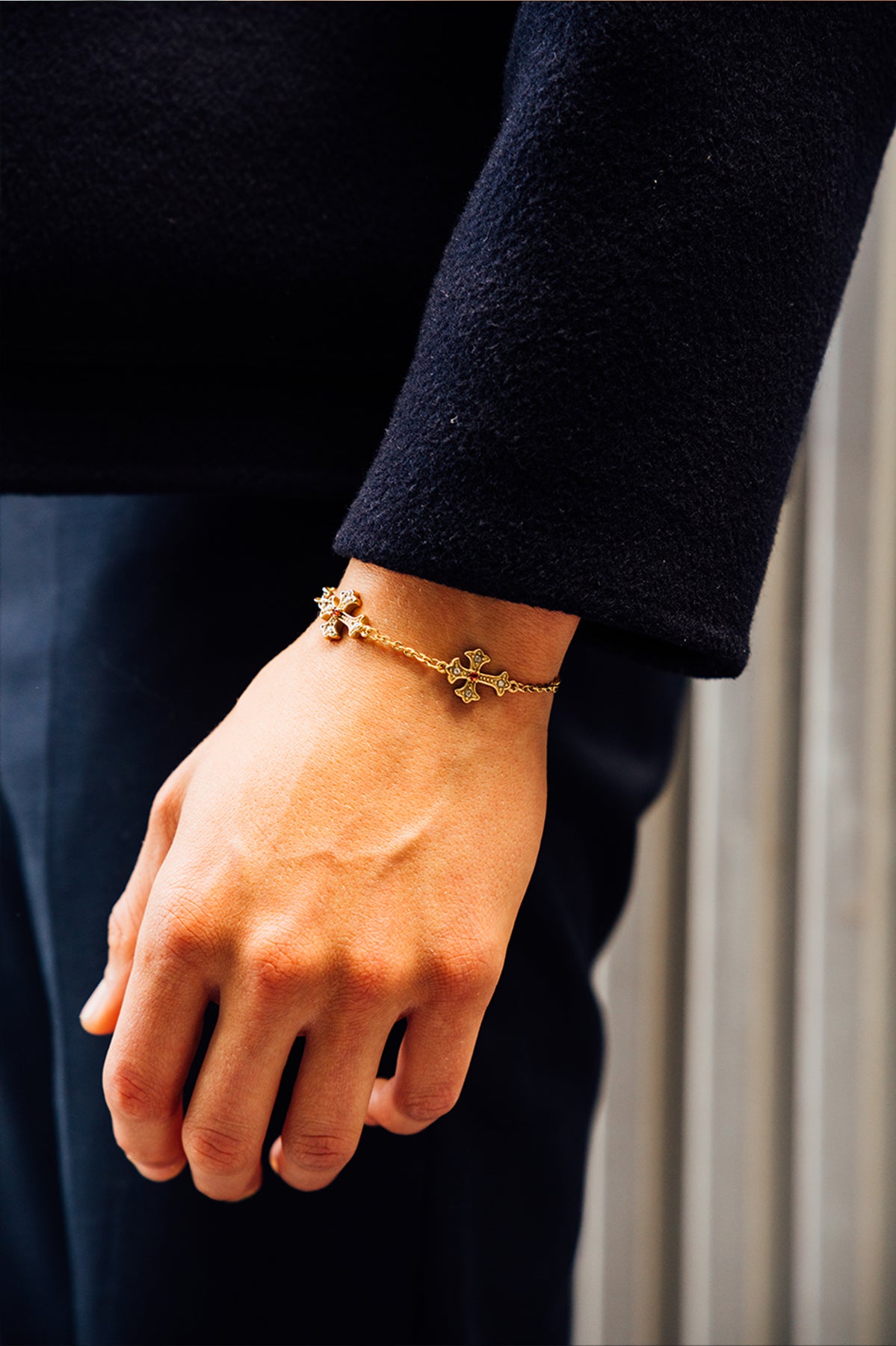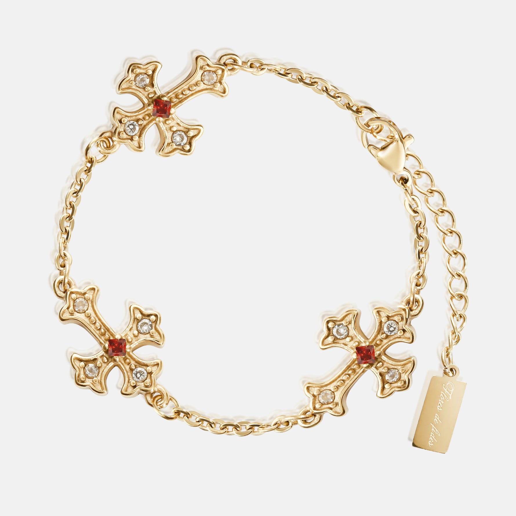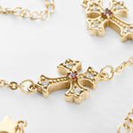 Handcrafted in 14k Gold, our Vintage Crucifix bracelet with triple cross design from the 1980s. Embedded with emerald & white zirconia gemstones, held on a figaro chain.