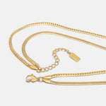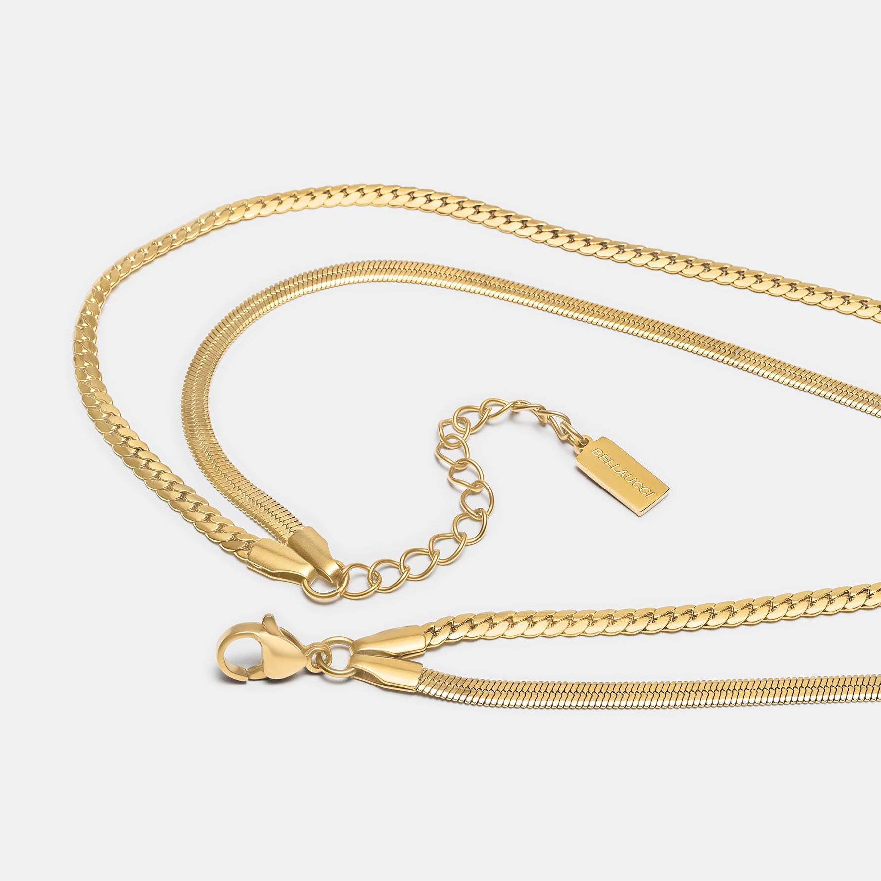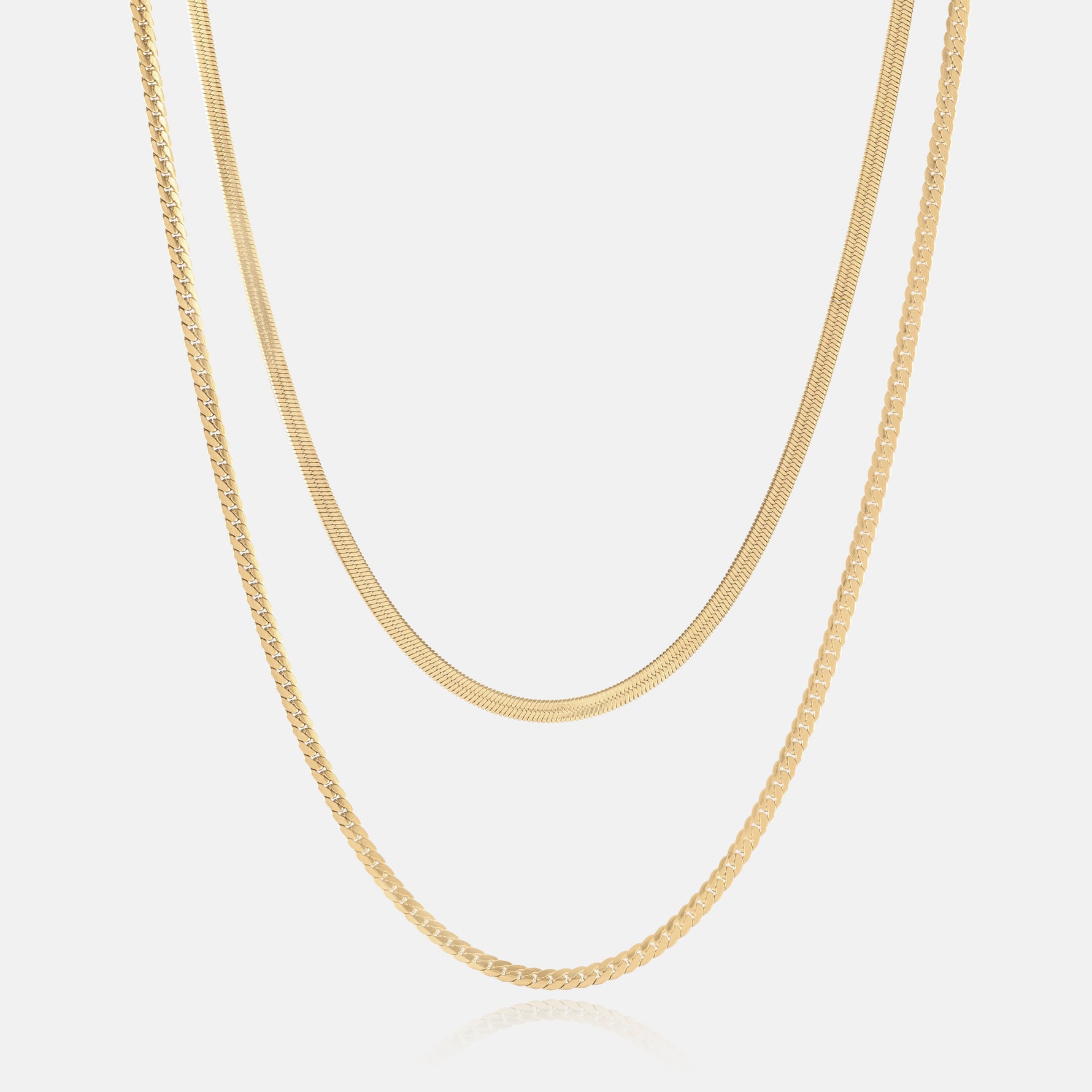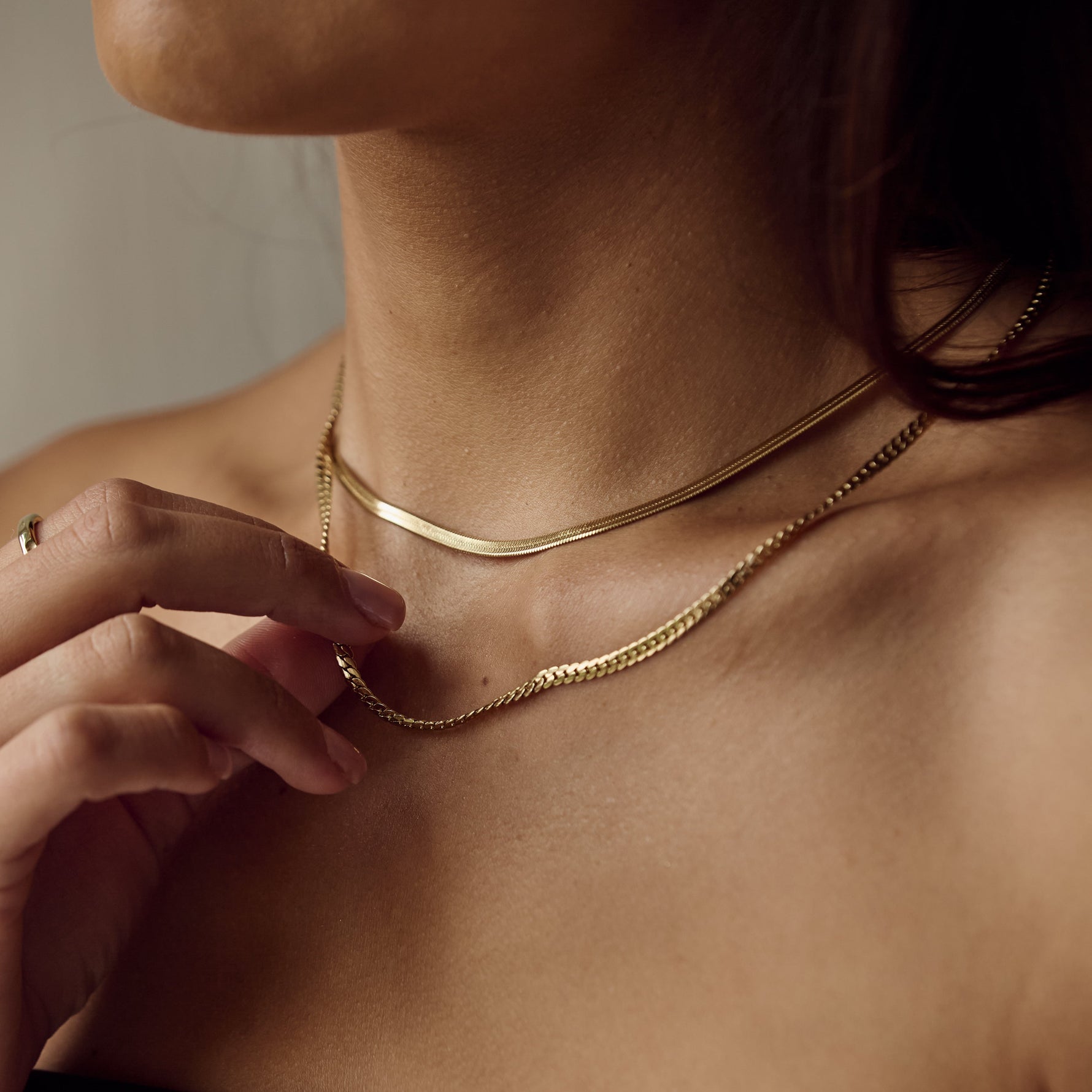 The Mayfair Layers — two chains, one statement. Designed to be worn together for effortless layering, this piece pairs a sleek snake chain with a classic curb link. Finished in 14k gold, waterproof and non-tarnish, it’s a timeless essential for everyday refinement.